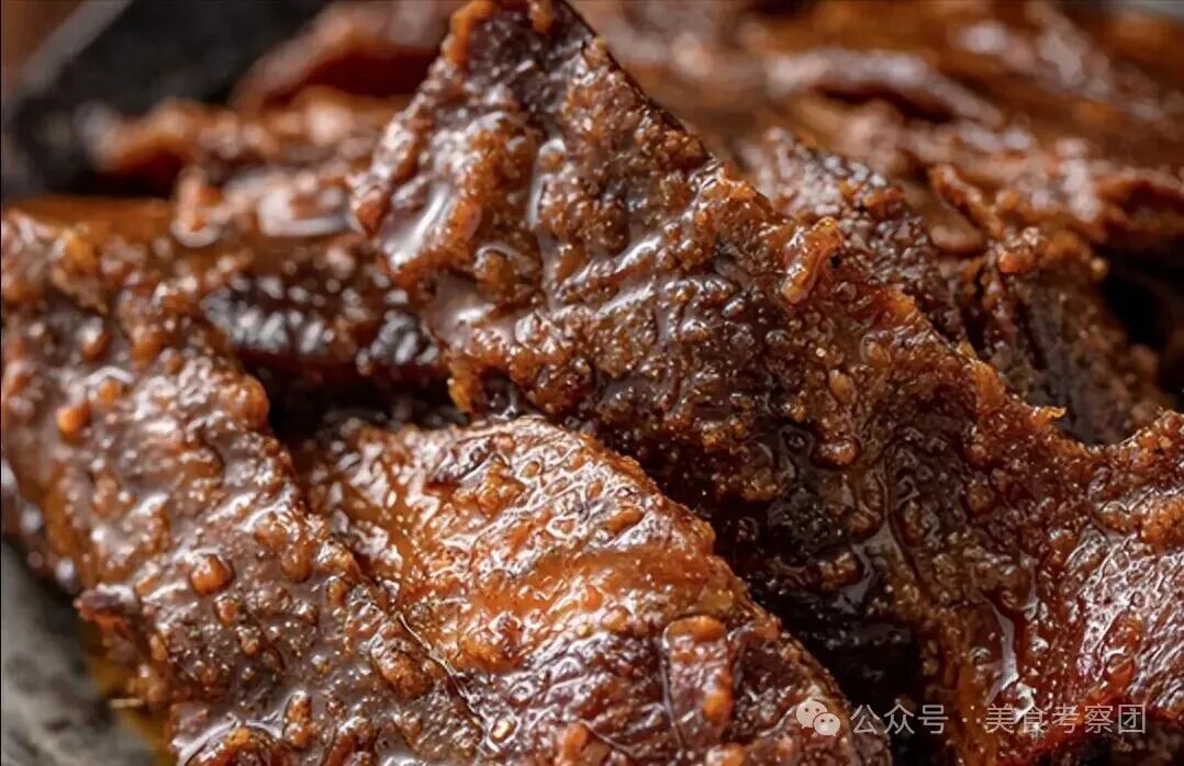 凌晨四点的老作坊里,黄牛肉正在酱缸里舒展筋骨。选用牛后腿最精瘦的部位,切成长条后,要用八角、桂皮、冰糖等十几种香料腌足 24 小时,再挂在竹架上阴干,最后入锅用小火慢炒,直到油脂析出,肉色变成透亮的褐红。