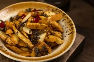 倒笃菜的原料俗称“冬芥菜”,传统手工制作方法是将新鲜冬芥菜经清洗、晾晒、堆黄、切碎,加盐揉搓后装瓮、倒笃、发酵腌制等一道道工序加工而成的,香味浓郁的倒笃菜与鲜嫩素雅的春笋融合,烹制出春季钱塘沙地人家老底子的味道,一筷入嘴,满口春天的味道,值得经久回味。