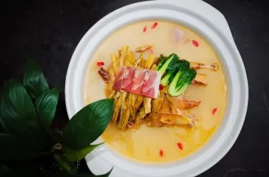 龙羊暖碗最初便是以猪骨、猪肚等熬汤,待到香气出来时把豆腐、冬笋、腌菜等食材放进,大火熬煮,小火慢炖,直至香味四溢,弥漫整个灶间。这便是龙羊山里的暖碗菜了。虽叫暖碗,用的其实是锅,铜锅底下烧上木炭,锅内的食材经炭火慢炖缓缓散发出诱人的香气,现已成为富阳又一极具特色的饮食文化。