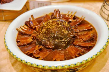蟹酿橙曾出现在清河郡王张俊招待宋高宗的宴席上,是名副其实的宋朝宫廷菜代表之一。南宋《山家清供》食谱中曾有记载:橙大者截顶,剜去穰,留少液,以蟹膏肉实其内,仍以蒂枝顶覆之,入小甑,用酒、醋、水蒸熟,加苦酒入盐,供,既香而鲜,使人有新酒菊花、香橙螃蟹之兴。因记危巽斋稹赞蟹云:“黄中通理,美在其中;畅于四肢,美之至也。”此本诸《易》,而于蟹得之矣,今于橙蟹又得之矣。