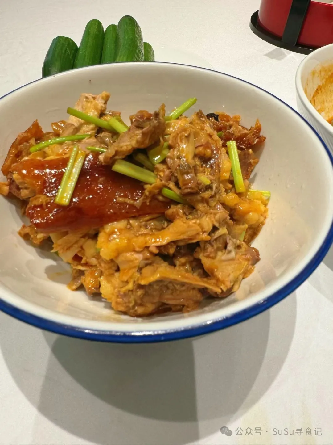 烤鸭两吃,鸭子做成片皮,鸭架凉拌。小师傅手法非常娴熟,配菜中包裹鸭子的有黄瓜,大葱,山楂条,烤鸭酱和白糖。面饼每层中都有油纸隔开,避免了撕不开或者几片黏在一起的问题。凉拌鸭架整体口感还不错,就是辣鲜露放的有点多了,反而口感上有点喧宾夺主吃不出鸭子的香味了。