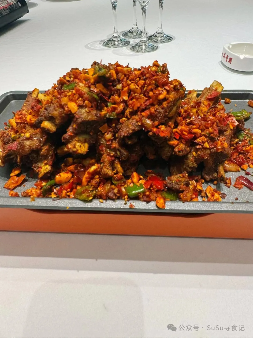 西域烤羊排,辣椒花生碎切小颗粒后炒的挺香,羊排应该是先白卤后再裹粉高温油炸的,炸的火候控制的也挺好,脆香中又带有软烂。