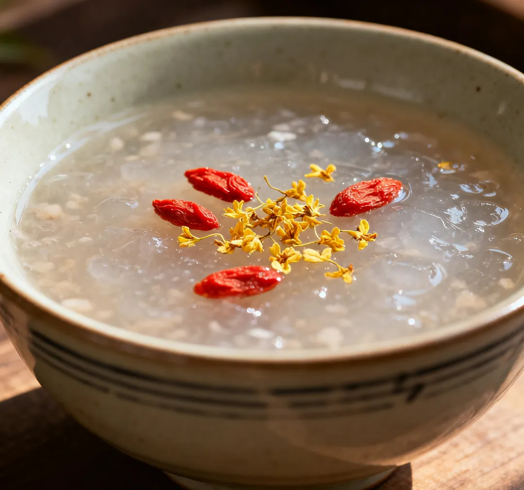 取银耳、雪梨、枸杞、冰糖适量。银耳泡发后与雪梨、枸杞同炖,具有清热生津、滋阴润肺的功效,对缓解秋燥引起的口干、干咳特别有效