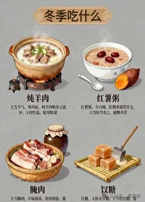 到了大雪节气,还有一些特色美食特别适合冬季养生。炖羊肉暖身又滋补,羊肉性温,能驱寒除湿,是冬季餐桌上的硬菜。