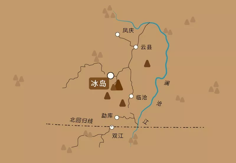 冰岛算是普洱茶众多山头中的后起之秀,比起老牌子的老班章、刮风寨等茶区,冰岛茶多了几分香甜柔顺。冰岛位于北纬23度、东经99度,海拔在一千六百米以上,属临沧茶区中的一颗璀璨之星。冰岛是傣族的寨子,旧称“丙岛”或“扁岛”,傣语的意思是“用竹篱笆做寨门的地方”或“送青苔的地方”。它是勐库地区海拔最高的傣寨,森林覆盖面积大,也许是冰岛成名较晚,又地处闭塞的大山之中,其茶树品种勐库大叶种的“血统”相对纯正许多。