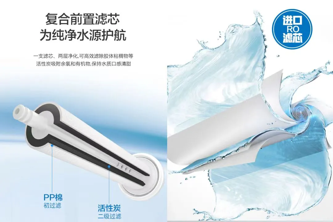 搭载三级滤芯,尤其是RO反渗透膜,过滤精度高达0.0001微米,深度净化,保障水质健康安全。