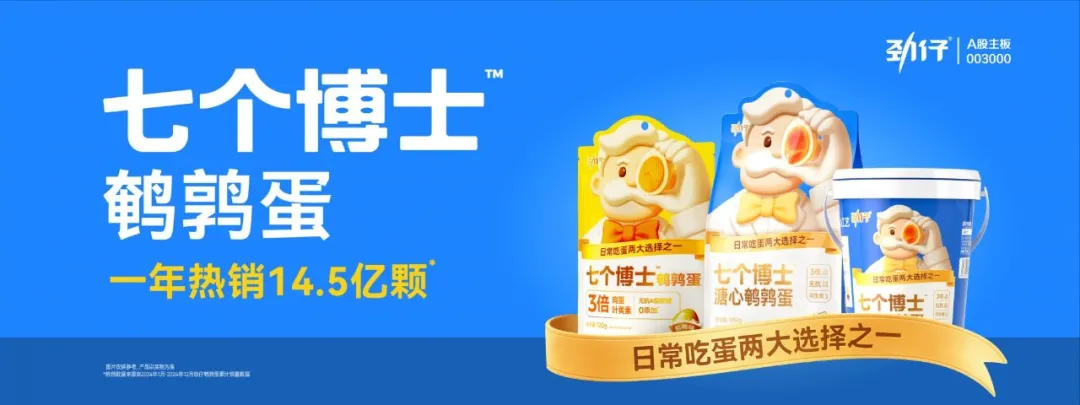 作为我国鹌鹑蛋零食领域的头部品牌,劲仔食品始终以品质为先,其子品牌“七个博士”聚焦鹌鹑蛋品类,以科研创新为锚,依托“无抗养殖”体系与溏心工艺技术,推出行业首创产品溏心鹌鹑蛋,以高品质和差异化回应消费者的健康需求,引领品类升级。劲仔食品被沙利文认证为“中国无抗生素鹌鹑蛋产品首创者”“中国包装溏心鹌鹑蛋首创者”。